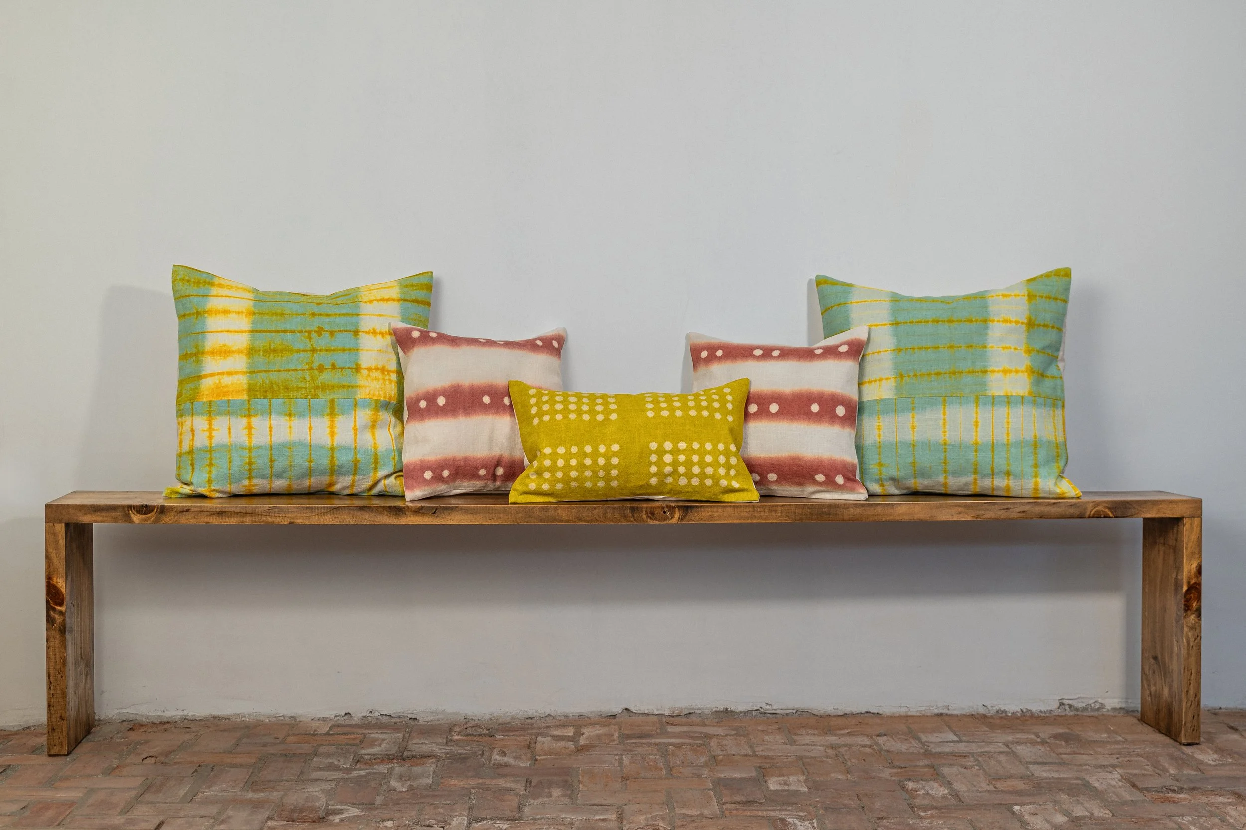 outer pillows beams + rays (with seam) - powder blue + sun / inner pillows fog stripes + ghost dots - pale garnet / center pillow ghost dots drift - golden ochre
